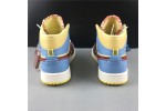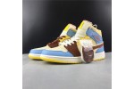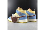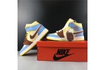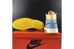 This Jordan 1 Mid SE is composed of a cream, brown, yellow, and light blue leather upper with red stitching on the heels and tongues. Maison Chateau Rouge branding on the heel tabs, sail midsoles, and yellow outsoles complete the design.