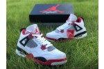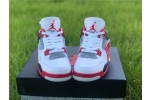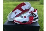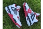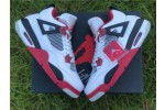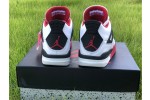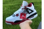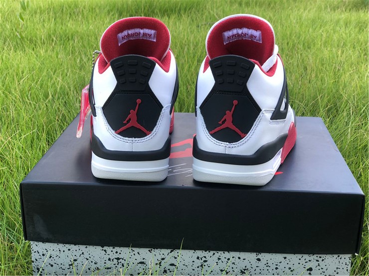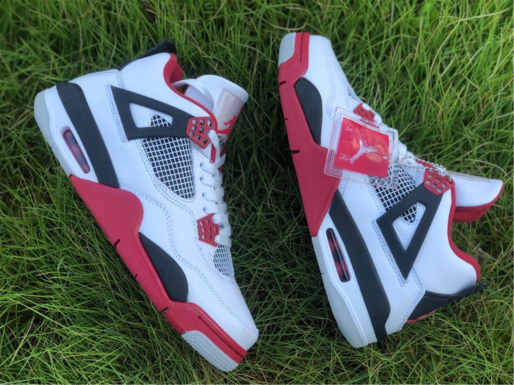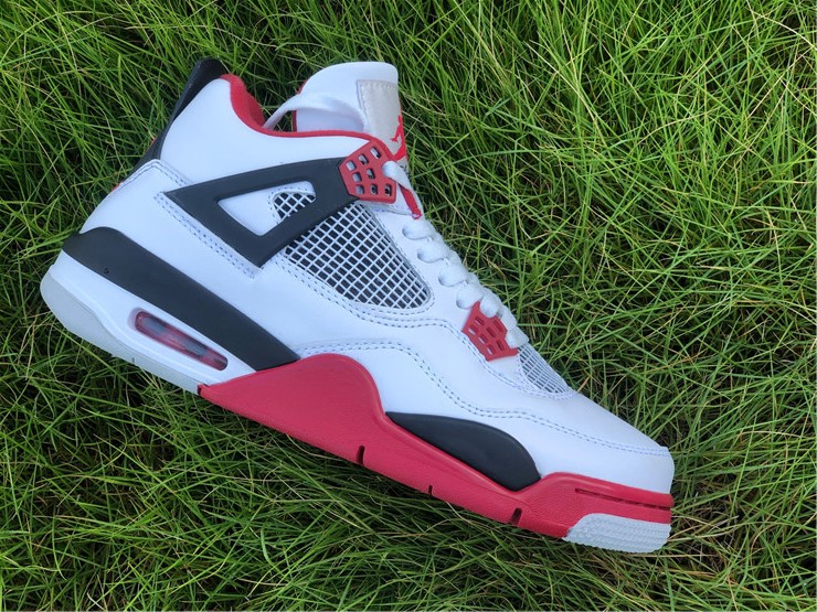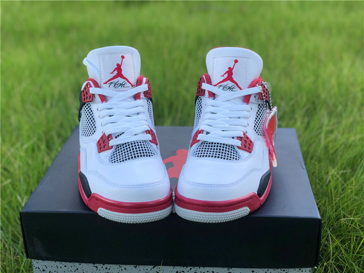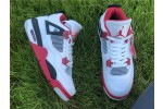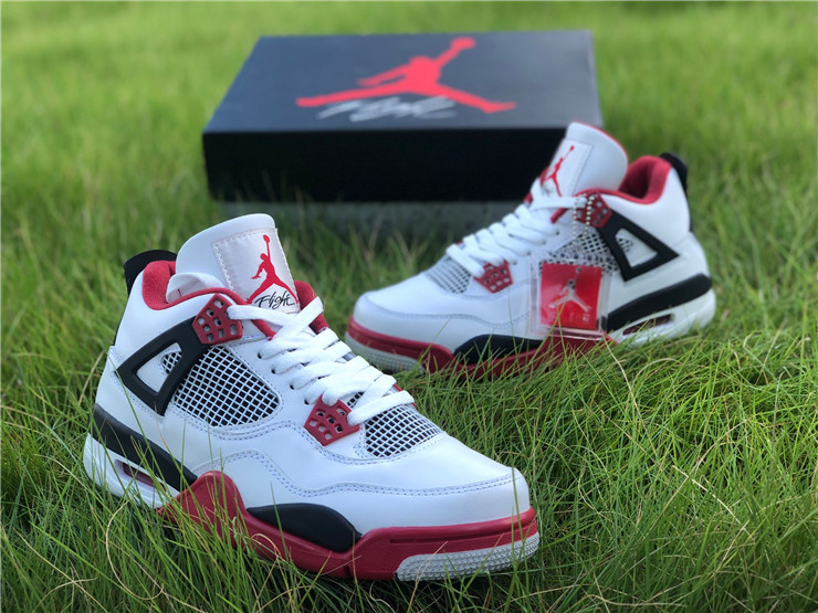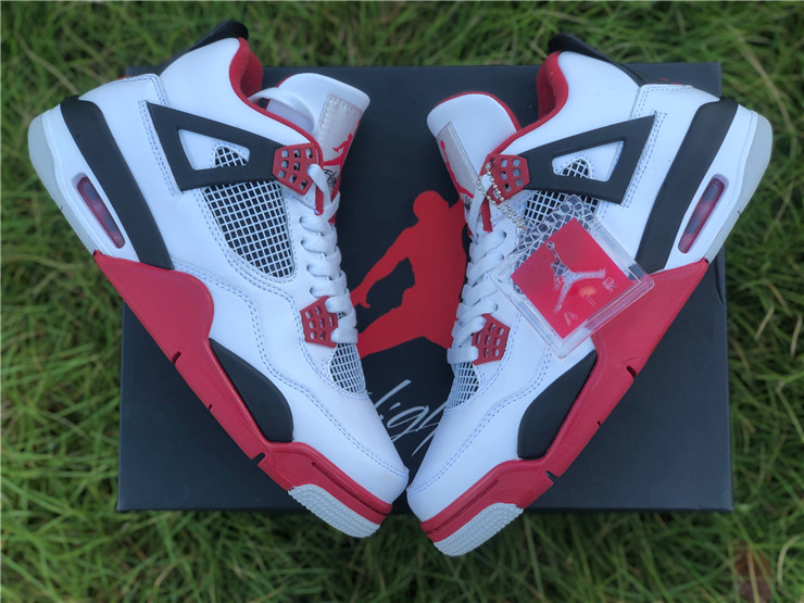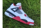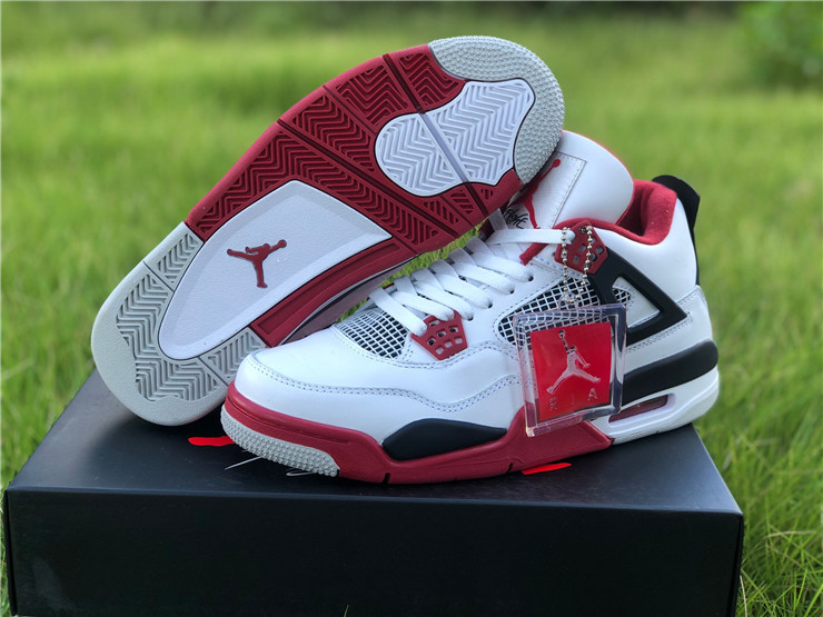 The Nike Air Jordan 4 Retro 'Fire Red' 2012 is based on the 1989 White/Fire Red OG colorway. The design combines a white leather upper, Fire Red and black accents, and an icy blue outsole. The sneaker also features Jumpman branding at the tongue and heel.