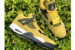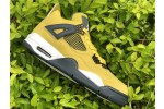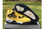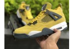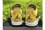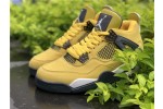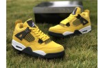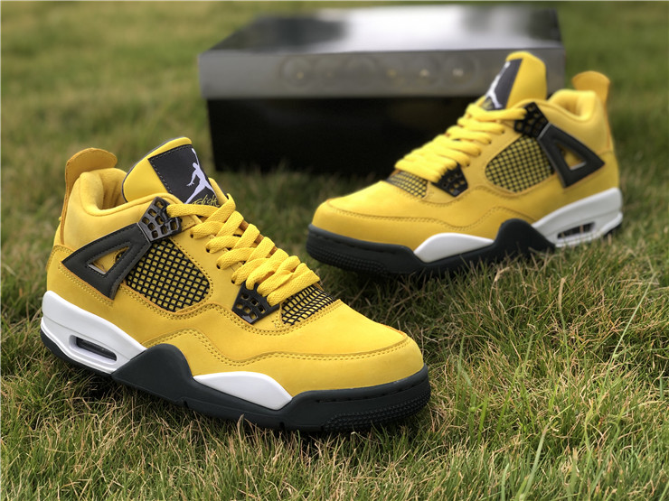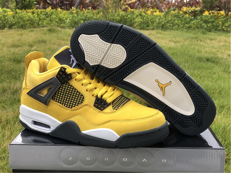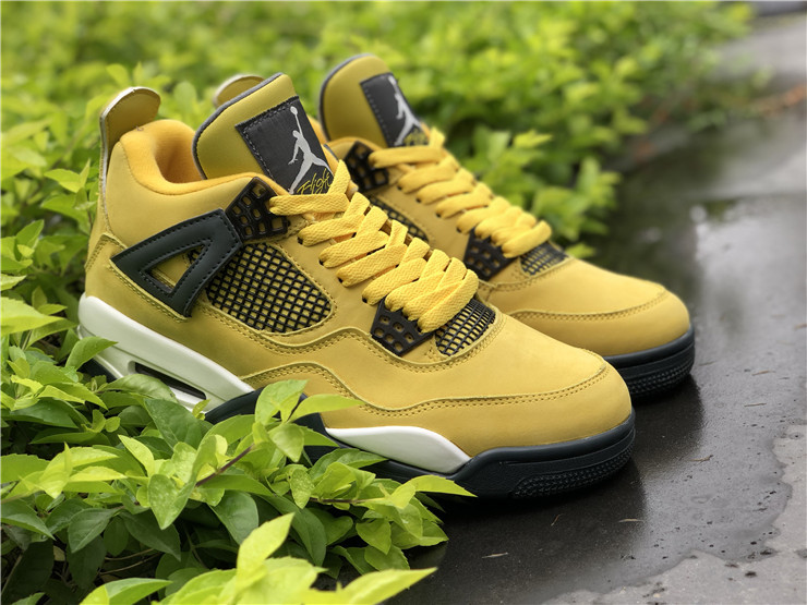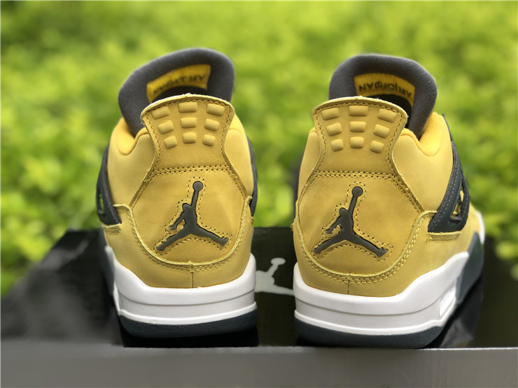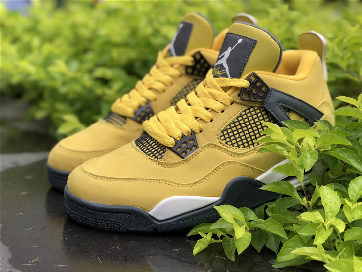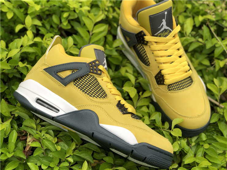 Dressed in a Tour Yellow, White, and Dark Blue Grey color scheme. This Air Jordan 4 looks very similar to the original, featuring a Tour Yellow nubuck upper paired with Grey detailing, Black hits on the netting atop a White midsole