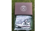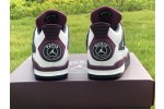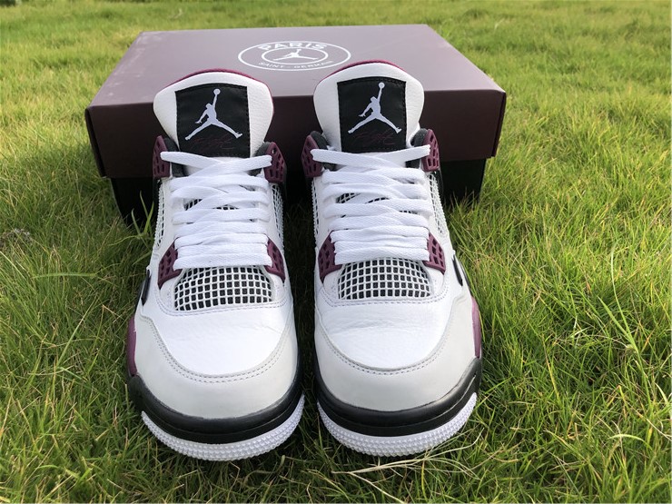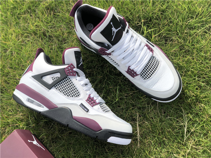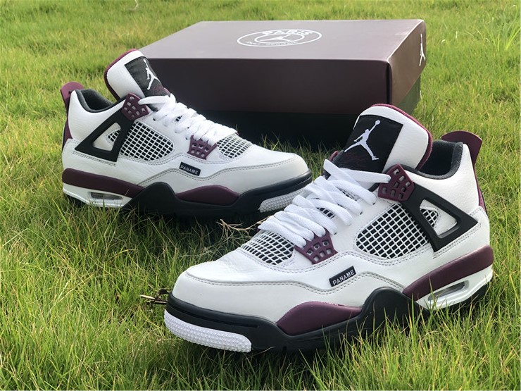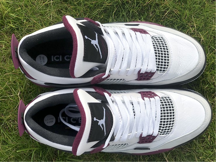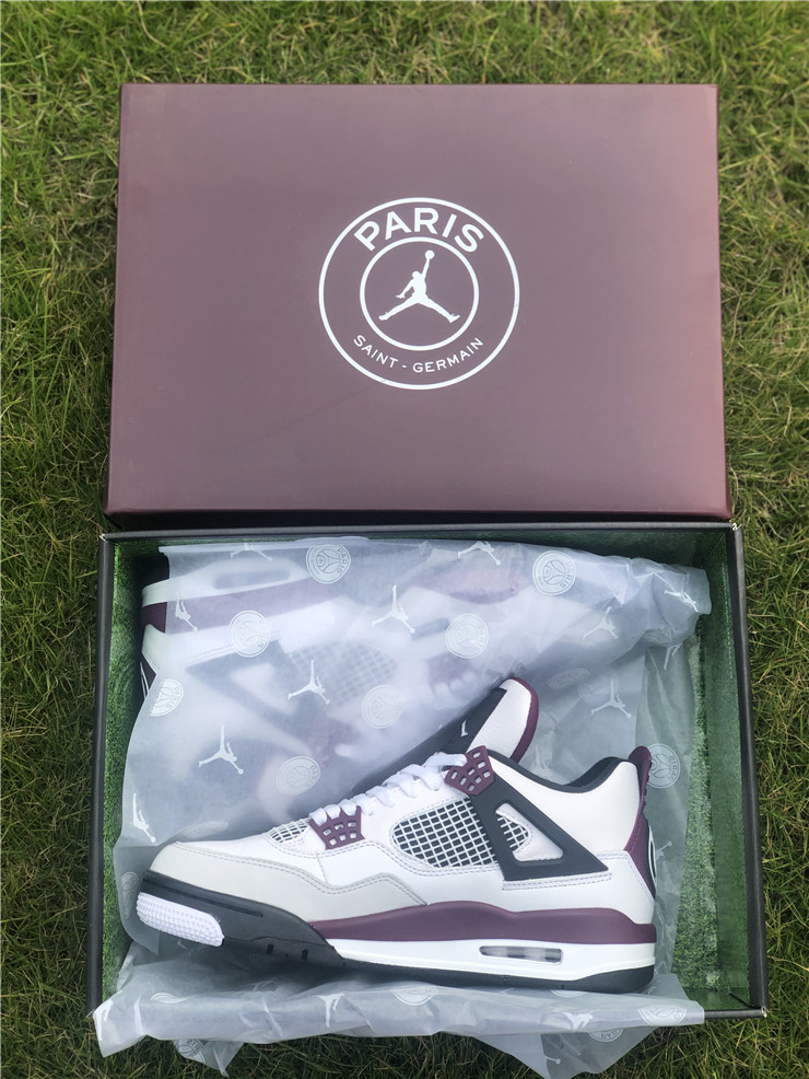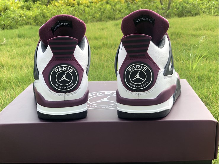 The Jordan 4 PSG features traditional color-blocking that is reminiscent of the classic Fire Red 4. White leather comprises the upper while grey nubuck paneling encompasses the toe wrap. Bordeaux purple and black coat the signature rubber wings, lace cages, and midsole. Finishing details include a “PANAME” text label on the lateral forefoot concluded with a “PSG” badge on the rubber heel tab.