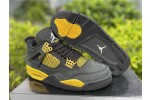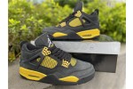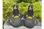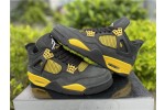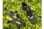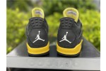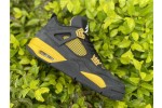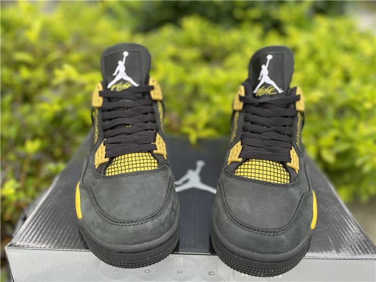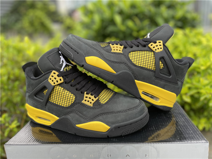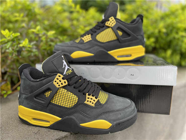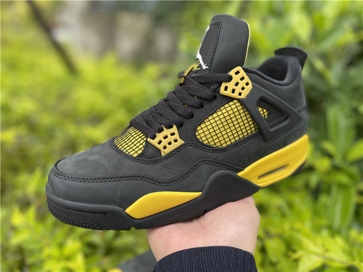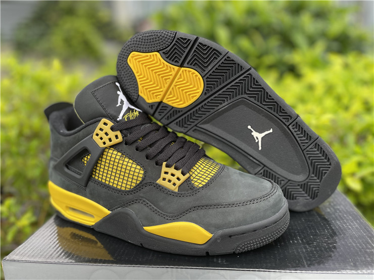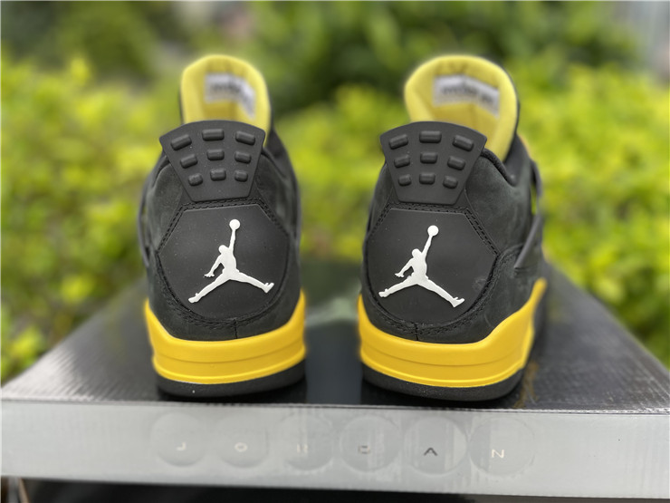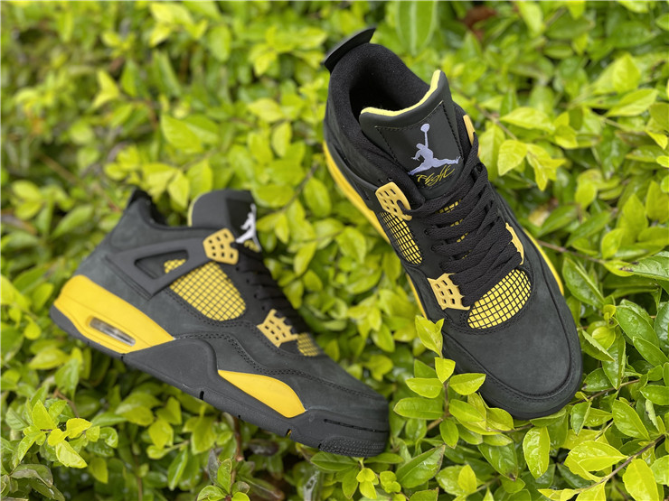 The 2012 edition of the Air Jordan 4 Retro ‘Thunder’ brings back one-half of the coveted ‘Thunder and Lighting’ pack from 2006. Smooth black nubuck is utilized on the upper, with contrasting yellow accents on the eyelets, quarter panel and interior tongue. The latter features a woven Jumpman-branded tag on the exterior side, complementing a second Jumpman logo on the molded heel panel. Lightweight cushioning arrives via a yellow polyurethane midsole with a visible Air sole unit nestled in the heel.