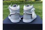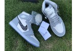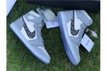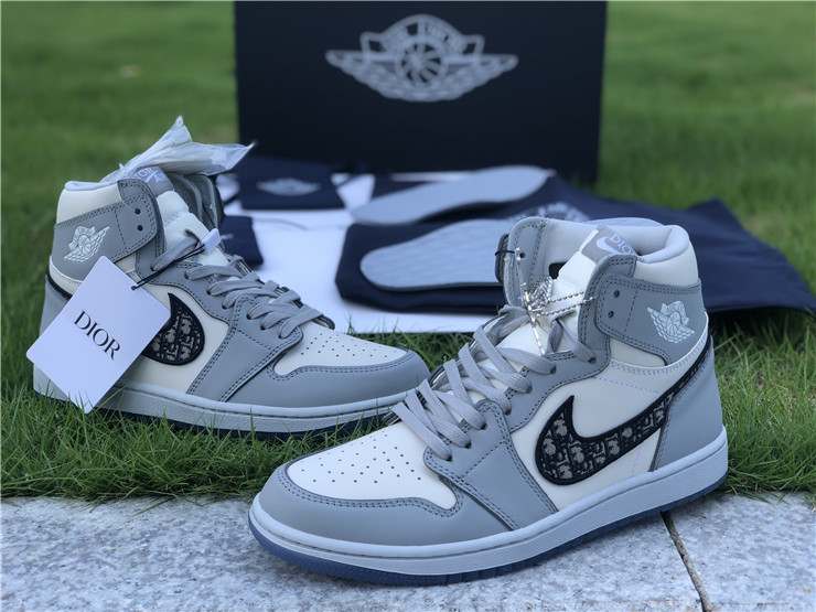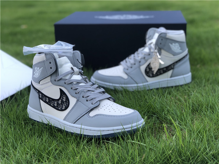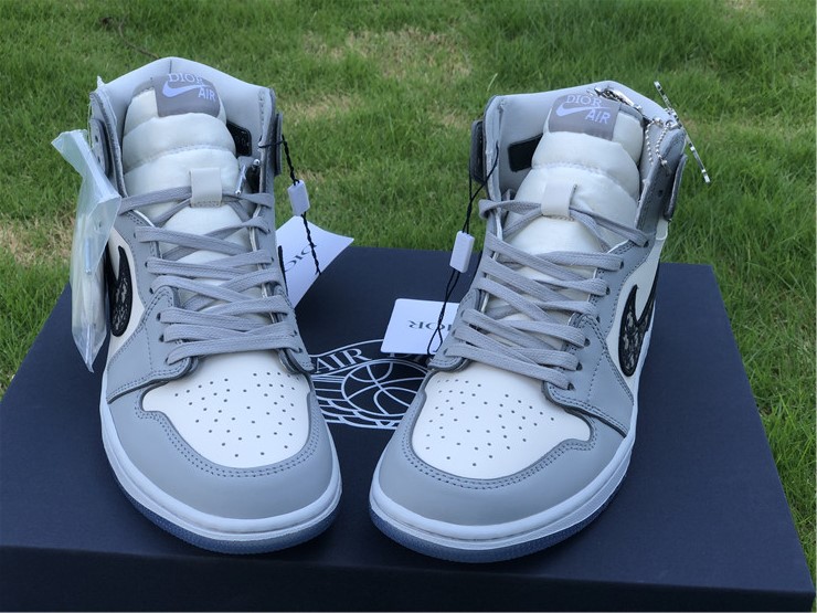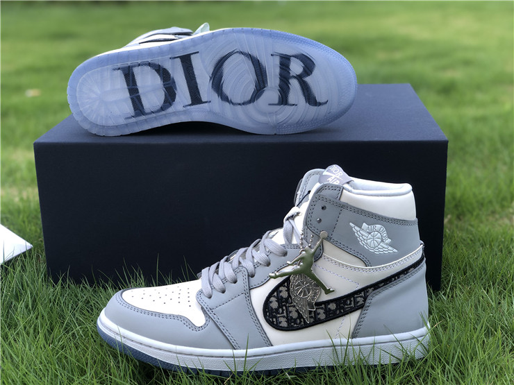This Jordan 1 Retro High is composed of a white and grey leather upper with traditional Dior monogram print Swoosh. Co-branded icy translucent soles, Dior branded tongue and Wings logo, and a silver “Air Dior” hang tag completes the design.